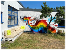 Bei der räumlichen Gestaltung des Treffpunktes nutzt das Team einen partizipativen Ansatz. Dieser reicht von der Auswahl der Spiele, über die Entscheidung über Einrichtungsgegenstände bis hin zur Wandgestaltung. Im Angebot Möbelbau z.B. setzen sich die Schüler*innen unter der Anleitung eines Teammitglieds mit dem Material Holz auseinander. Zudem werden die Schüler*innen bei der Gestaltung und Pflege des anliegenden Gartens beteiligt.