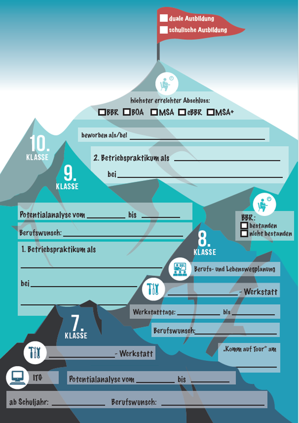 Der Berufsnavigations-Berg ist die erste Seite / das Deckblatt im schulinternen Berufsnavigationsordner, der den Berufswahlpass ersetzt hat und von der achten Klasse bis zum Ende der zehnten Klasse geführt wird. Hier werden alle Arbeitsblätter, Informationen und berufliche Materialen eingeheftet.