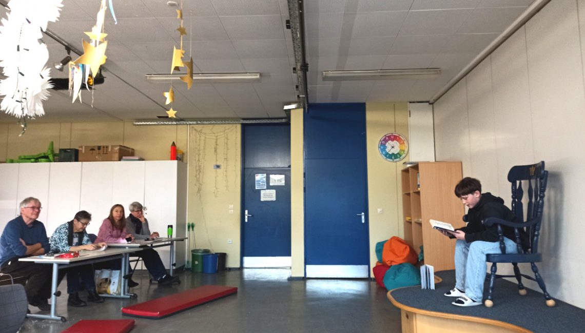 Am Anfang mussten wir warten, bis alle Teilnehmer mit ihrer Unterstützung da waren. Dann losten wir die Reihenfolge für das Vorlesen aus. S. aus der 456d begann, dann folgten Niklas (456c), H. (456f) und Luca (456e). Ich war als fünfte dran, und dann kamen noch Lilli (456a) und David (456h).