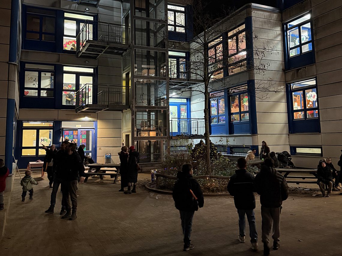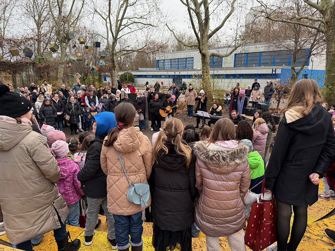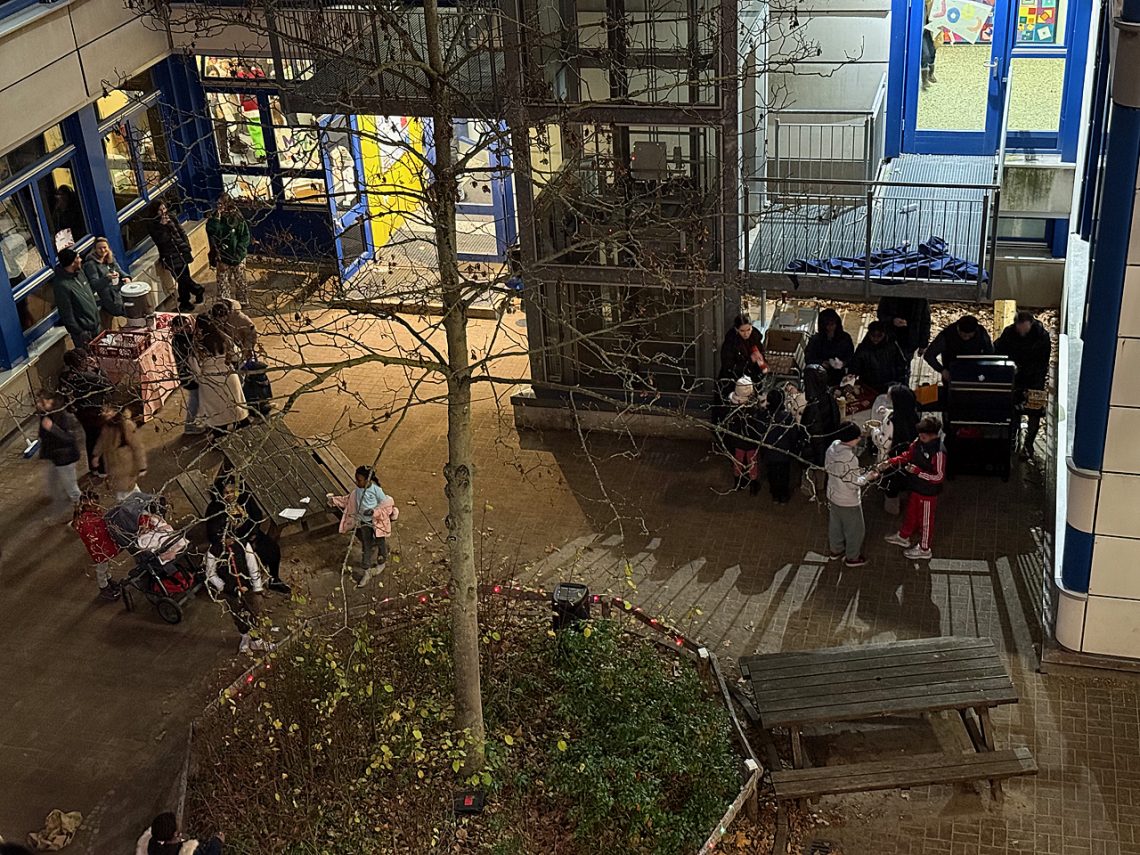 Den Auftakt machte um 15 Uhr Kinderchor, der stimmgewaltig das Sankt-Martins-Lied „Lichterkinder“ mit Rap-Einlagen sang und dabei von der Pädagog:innen-Band aus Frau Witzel (Geige), Frau Mahbub (Gitarre), Frau Plewe (Keyboard) und Herrn Reimers (Drums) begleitet wurde. Danach begrüßte unsere Schulleiterin Frau Wengler die Besucher:innen und eröffnete das Fest.