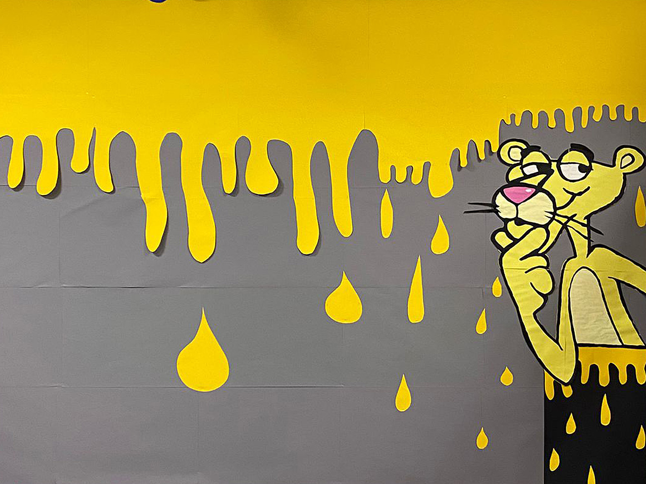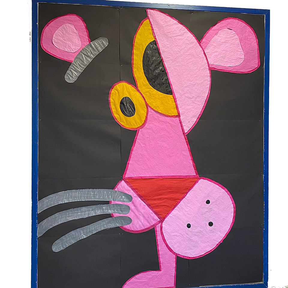 Die in der Vorhalle von Haus 1 aufgehängten Panther haben Schülerinnen und Schüler der Mittelstufe gestaltet. Ein gelber Panther ist auch in Haus 5 zu sehen.