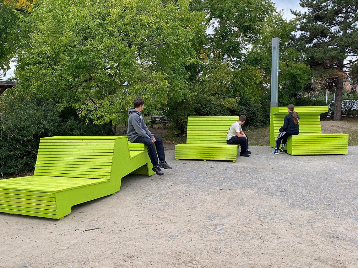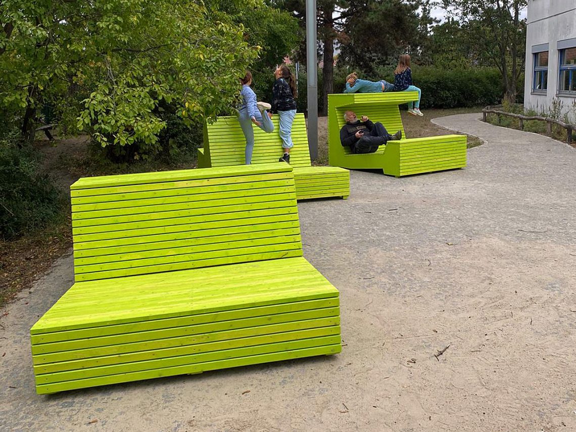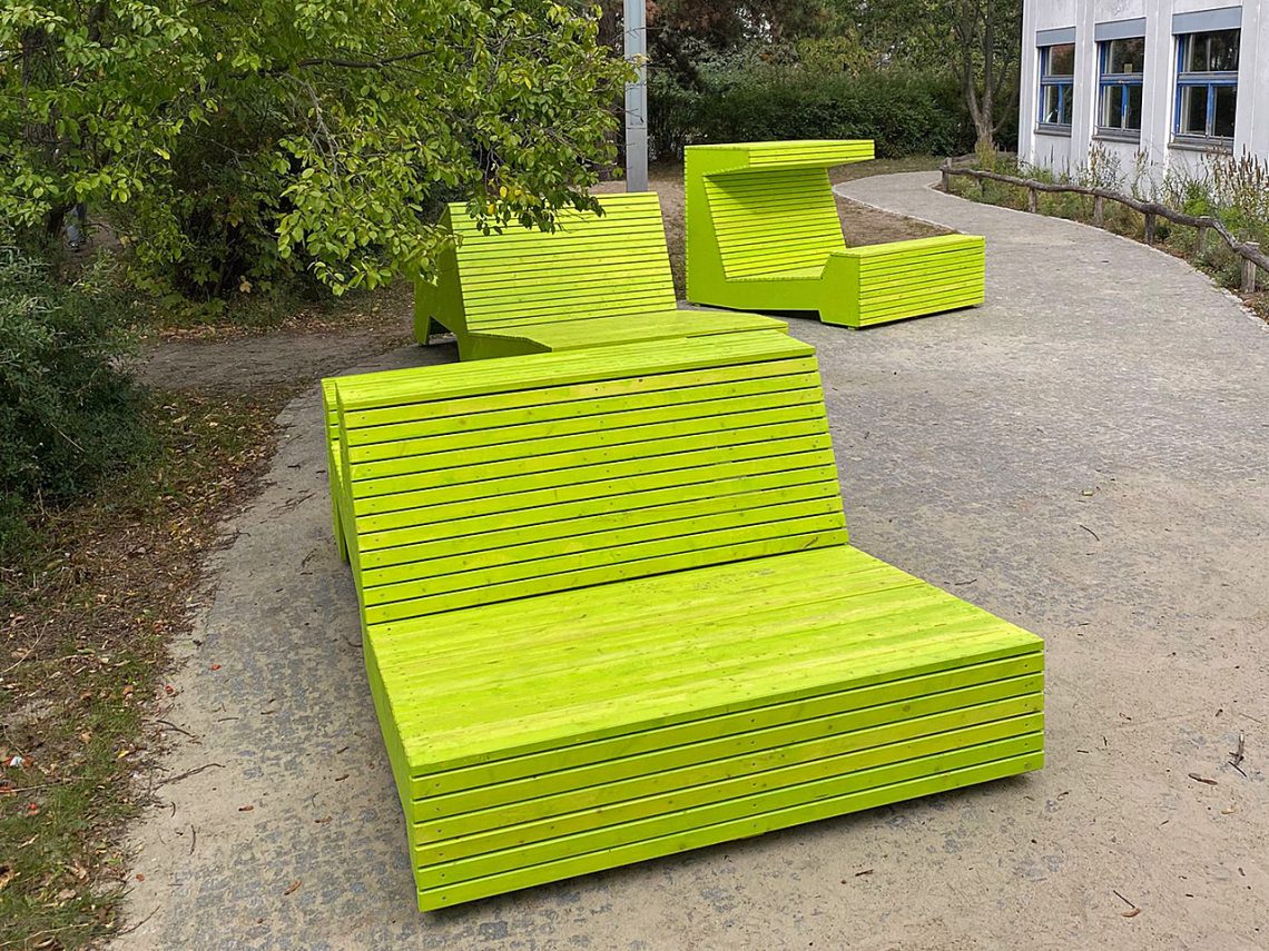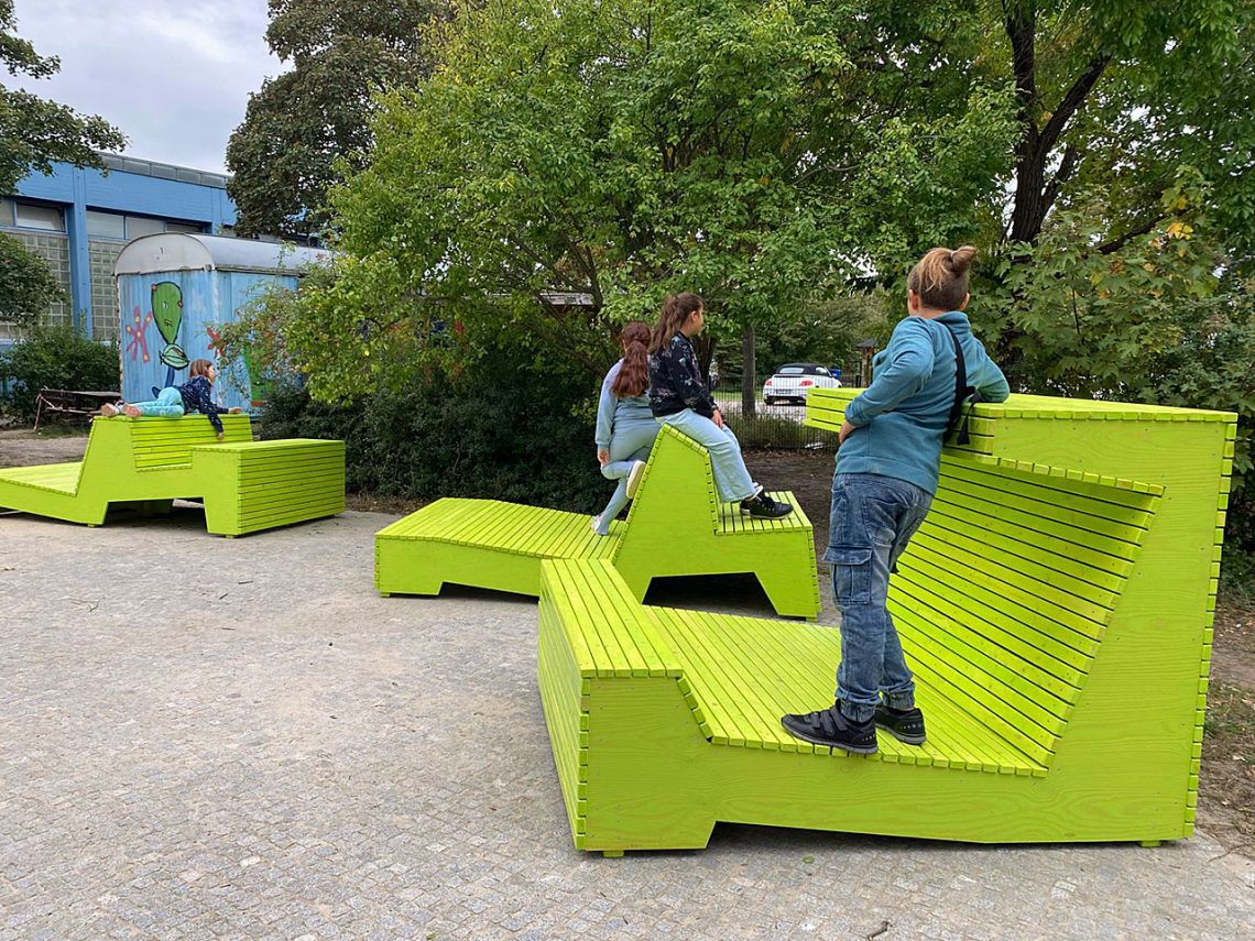 Auf dem Schulgelände des Campus Hannah Höch gibt es neue Sitzmöbel. Schülerinnen und Schüler der 456er-Lerngruppen haben sie zusammen mit unserer Kunstlehrerin Frau Schreyer-Lange und dem Künstler Thomas Wienands gebaut und angemalt. Sie brauchten dafür 5 Tage: vom 22. bis 26. September.