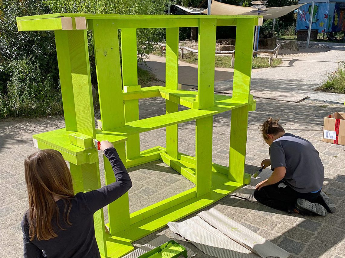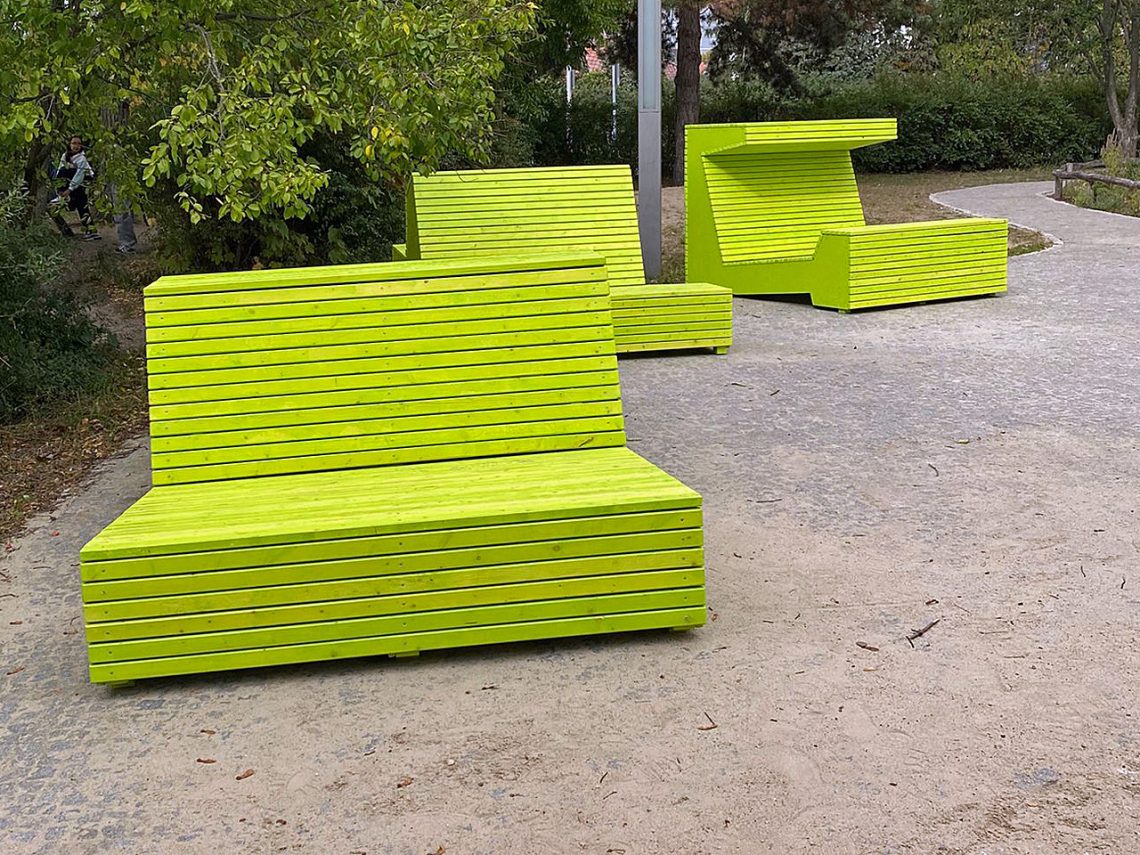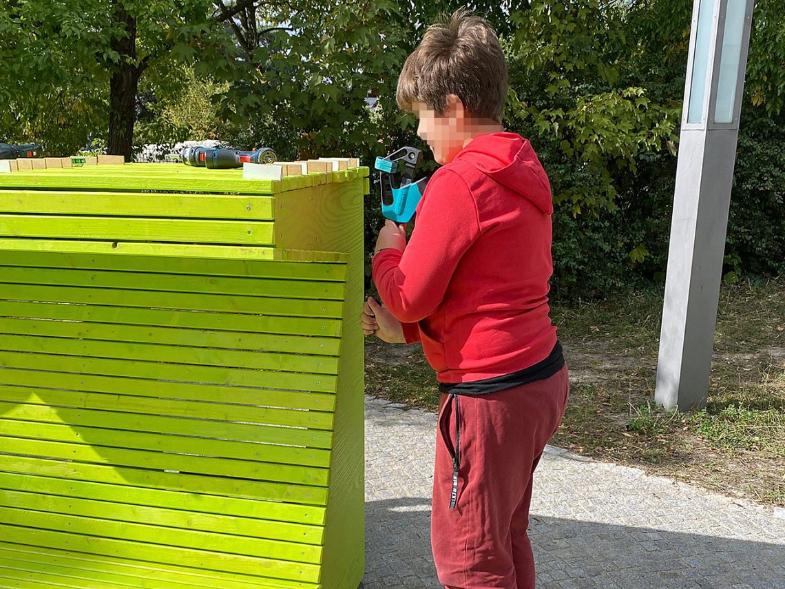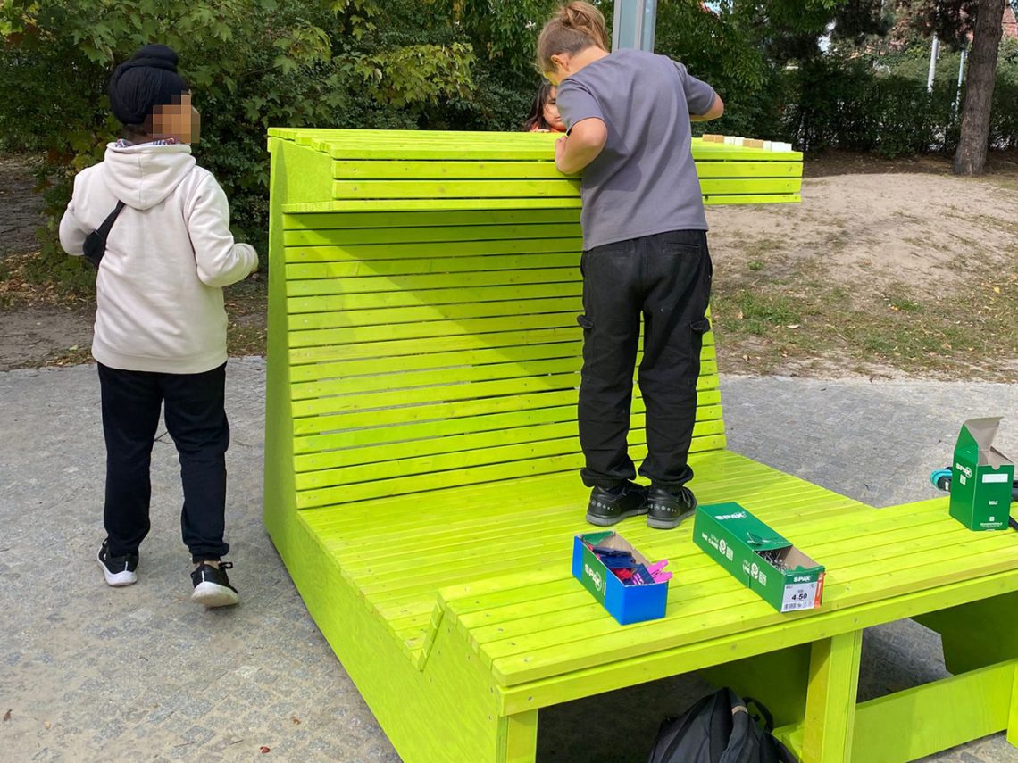 Auf dem Schulgelände des Campus Hannah Höch gibt es neue Sitzmöbel. Schülerinnen und Schüler der 456er-Lerngruppen haben sie zusammen mit unserer Kunstlehrerin Frau Schreyer-Lange und dem Künstler Thomas Wienands gebaut und angemalt. Sie brauchten dafür 5 Tage: vom 22. bis 26. September.