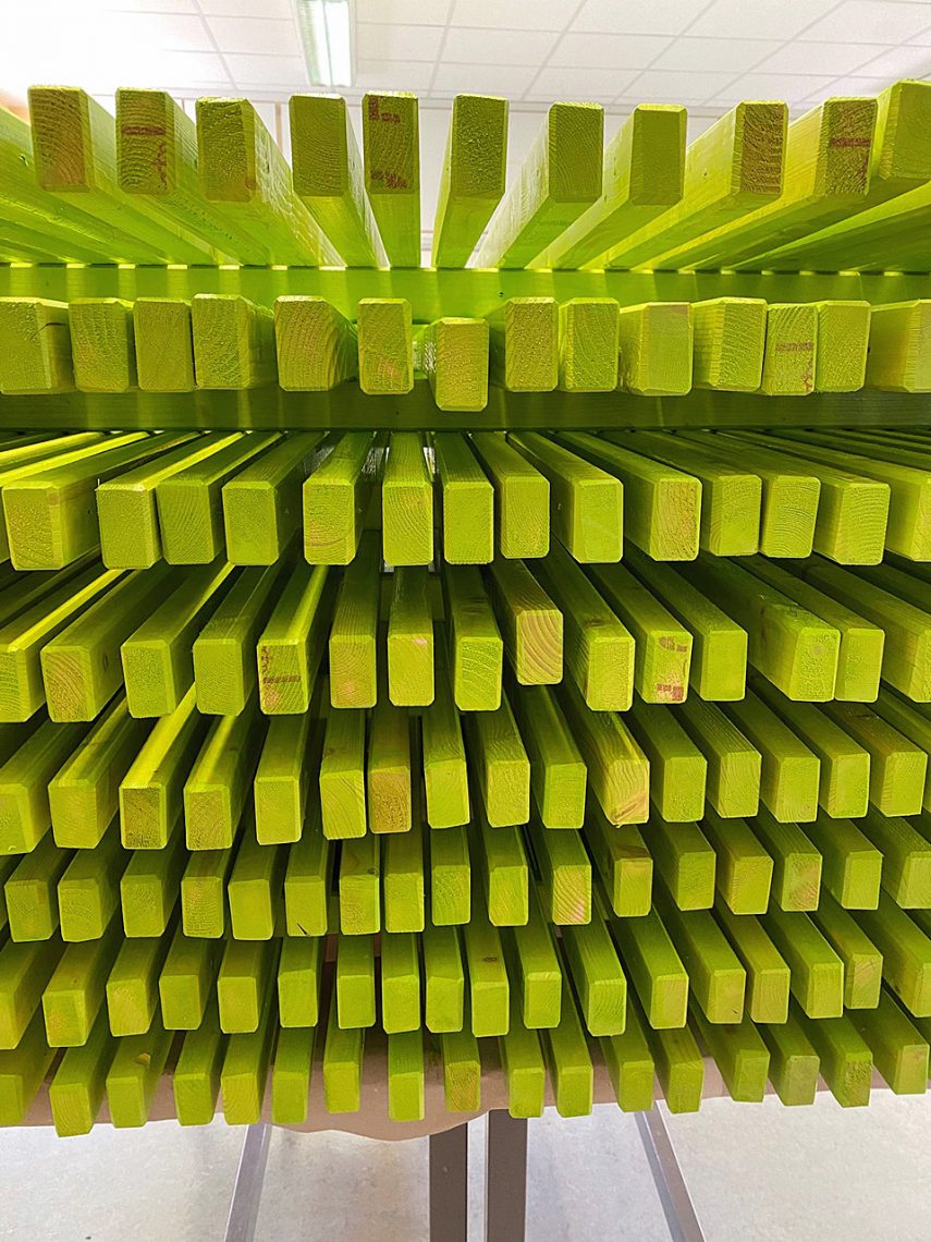 1. Tag: Wir haben 350 Bretter geholt. Wir haben die Bretter mit neongrüner Ölfarbe bestrichen.