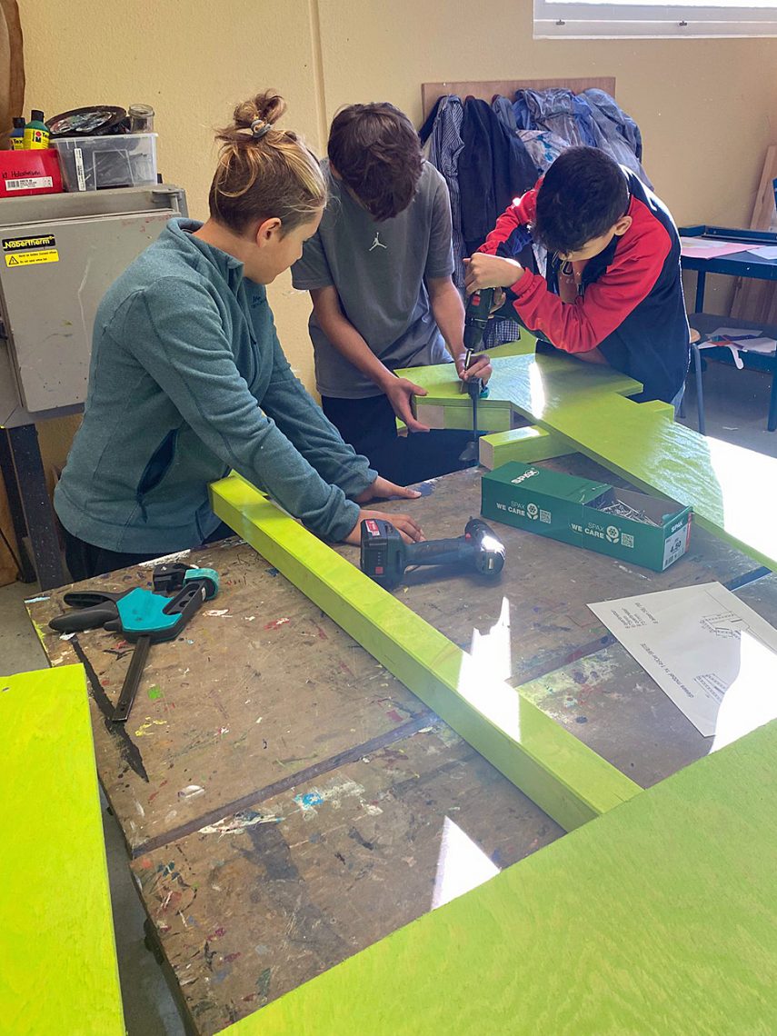 Sophie und Louis nahmen am Holzprojekt teil. Sie berichten, wie der neongrüne Grashüpfer entstanden ist: