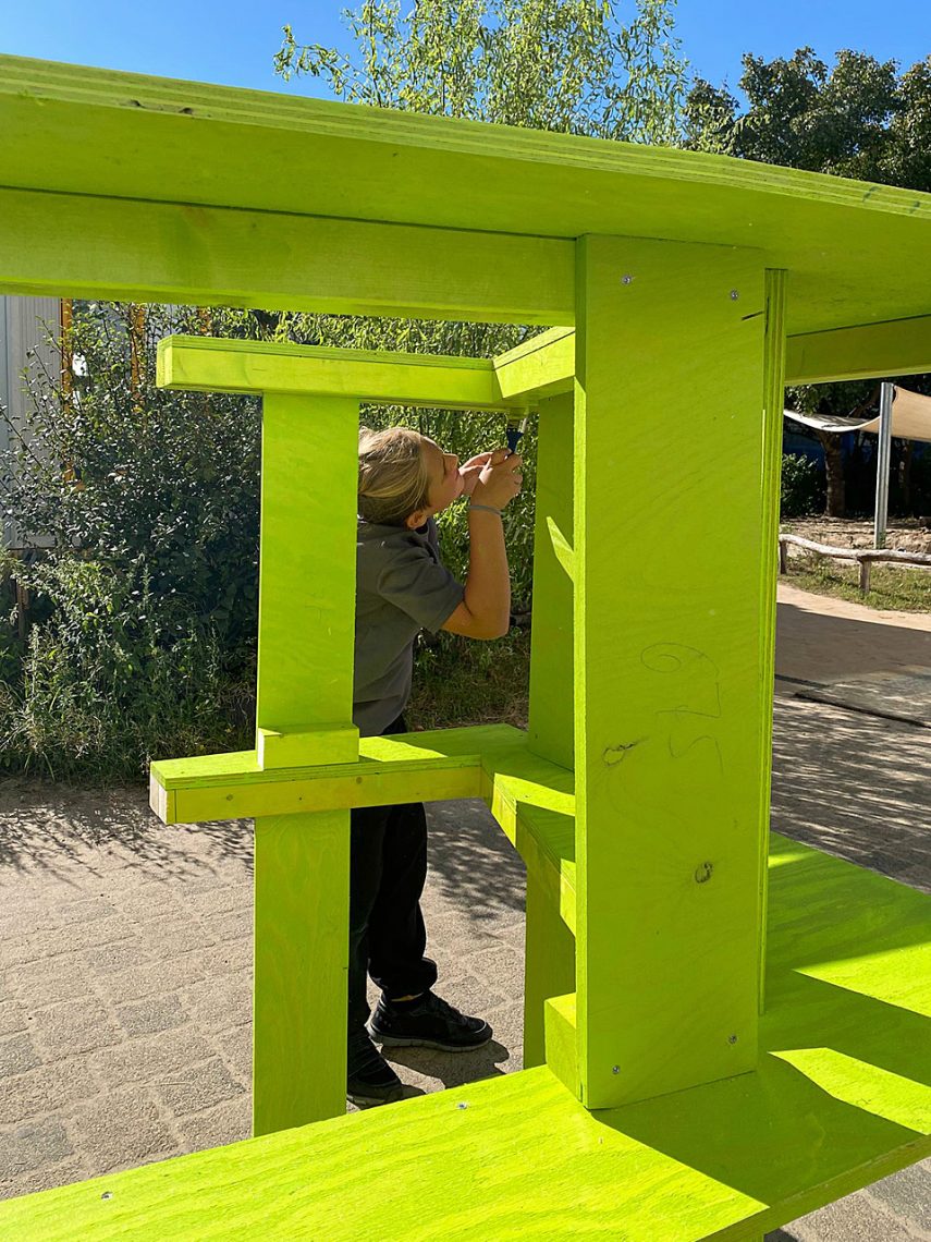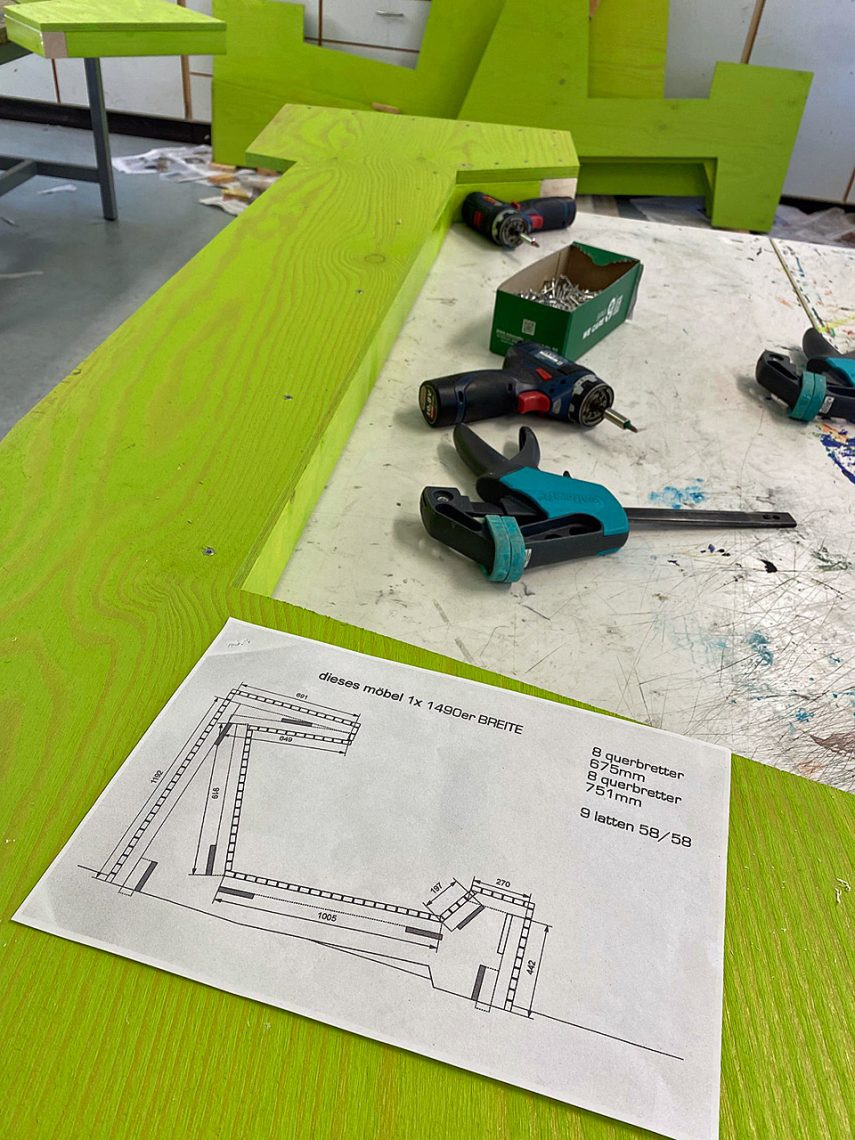 Es ist das vierte Mal, das Kinder mit Herrn Wienands solch große Sitzmöbel für das Campus-Gelände gebaut haben – jedes Jahr eines. Es gibt noch den Roten Riesen, den Blauen Schlitten und den Lila Raketenfisch.