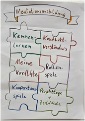 Die Schulsozialarbeit ist an der Planung und Durchführung der Ausbildung der Schul-Mediator*innen beteiligt. Bis zu 20 Schüler*innen werden jährlich in der Jugendbildungsstätte Kaubstraße im Rahmen von Ausbildungsfahrten und Projekttagen ausgebildet und deren Mediations-Arbeit im Rahmen einer AG betreut. Während der Ausbildung lernen die Kinder und Jugendlichen die Phasen einer Mediation kennen und erproben diese in Rollenspielen. Sie setzen sich mit ihren eigenen und Konflikten anderer auseinander und verbessern ihren persönlichen Umgang mit diesen. Nach der ersten Ausbildungsfahrt und den Projekttagen wird den Schüler*innen feierlich ein Zertifikat überreicht. Als ausgebildete Mediator*innen führen sie dann selbstständig Mediationen mit Schüler*innen an der Schule durch.
