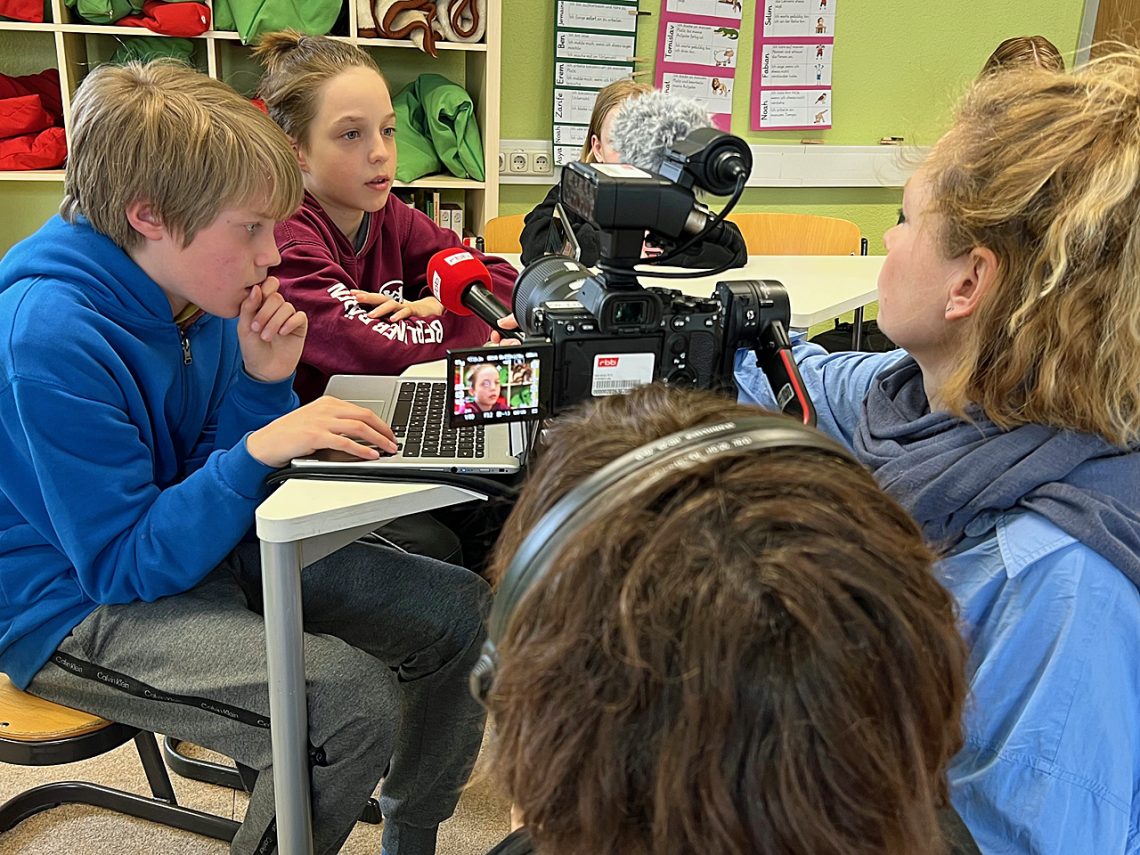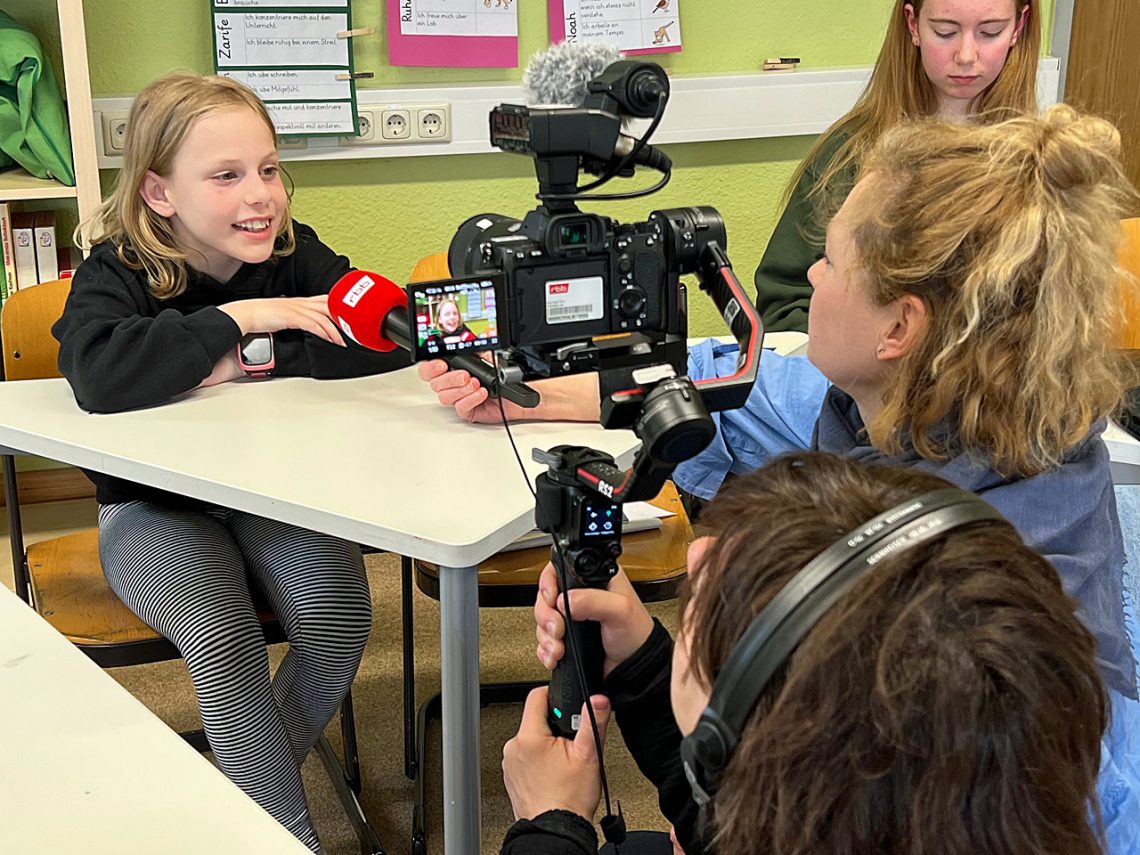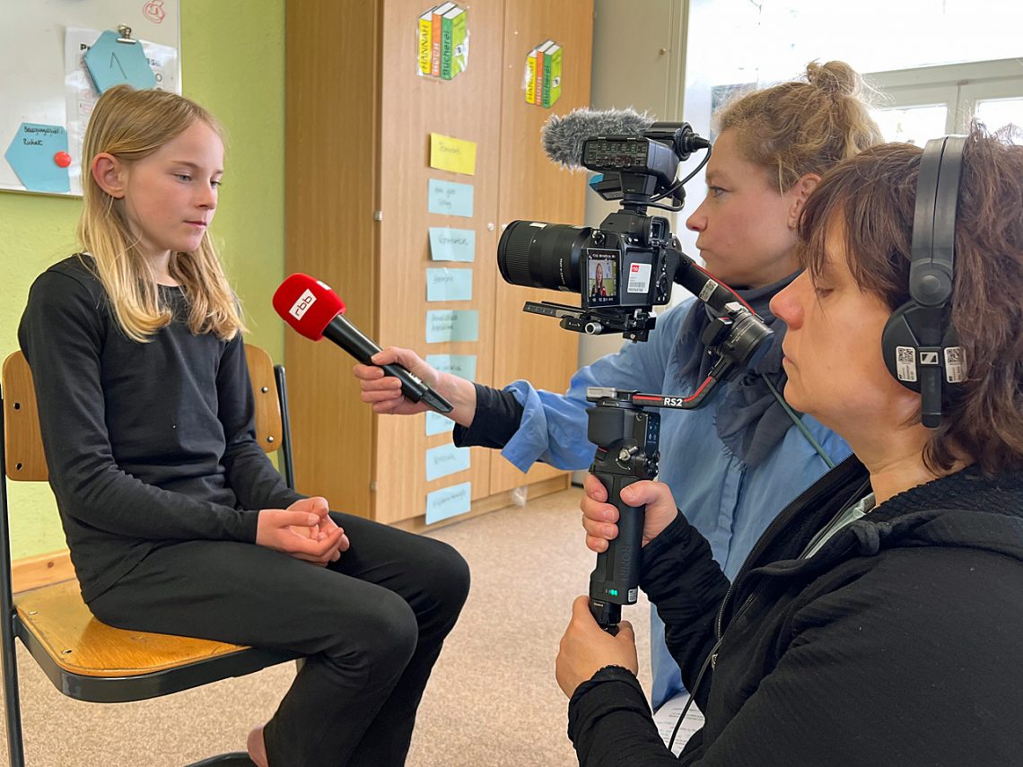 FRAU RUBARTH: Dafür erzähle ich am besten, wie die Produktionswoche aussieht: Am Montag haben wir uns in der Redaktion darüber verständigt, dass wir mit jungen Menschen über Presse- und Meinungsfreiheit sprechen wollen und überlegt, wie wir am besten mit wem sprechen können. Am Dienstag habe ich mehrere Berliner Schülerzeitungen kontaktiert und gefragt, ob ich bei ihnen drehen kann. Das ist nicht immer einfach, weil man dafür die Einverständnis der Eltern und der Schule braucht. Und natürlich müssen die Kinder Lust darauf haben. Dann haben sich mehrere Redaktionen zurückgemeldet und ich habe überlegt: Zu wem gehe ich? Wann kann ich drehen? Wann habe ich ein Kamerateam? Dann haben wir bei euch gedreht und ich habe gemeinsam mit einer Cutterin den Film geschnitten und nach der Abnahme – also dem Ok meiner Redakteurin – habe ich den Film mit Hilfe eines Toningenieurs im Synchronstudio eingesprochen. Also im Grunde: eine Redakteurin, eine Autorin/Reporterin, eine Kamerafrau, eine Cutterin, ein Toningenieur – fünf Menschen.