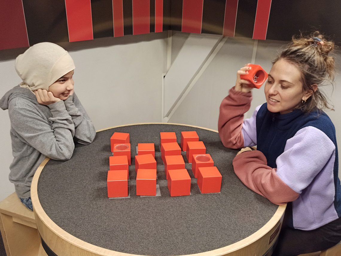 Frau Poznyak ist also für die ukrainischen und die syrischen Kinder sowohl in der Mittelstufe, als auch in der Grundstufe zuständig. Zusätzlich unterstützt sie die Grundstufen-Kinder in Förderstunden auch im Unterricht in den Regelklassen, damit sie dort richtig mitarbeiten können. „Unser Team ist eine sehr gute Mischung“, meint Frau Poznyak. „Es ist sehr schön, an dieser Aufgabe im Team zu arbeiten und sich mit den Kolleginnen austauschen zu können.“