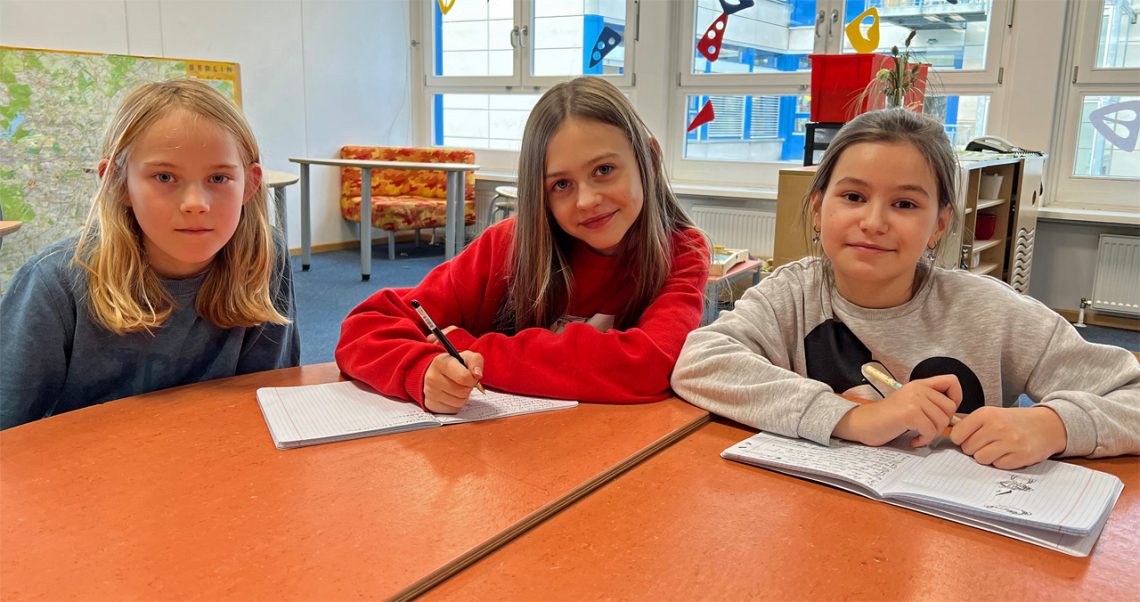 Schule am Campus Hannah Höch ist anders als in ihrer Heimat. Das haben die beiden ukrainischen Schülerinnen Farida und Slata schnell festgestellt. Aber obwohl sie bei uns als Grundstufen-Schüllerinnen auch in einer 456er-Regelklasse unterrichtet werden, haben sie noch viele offene Fragen über den Ablauf in ihrer Lerngruppe. Die Antworten auf ihre Fragen holten sie sich von ihrer Mitschülerin Yuna, die aber auch gleich ein paar Fragen an die beiden hatte.