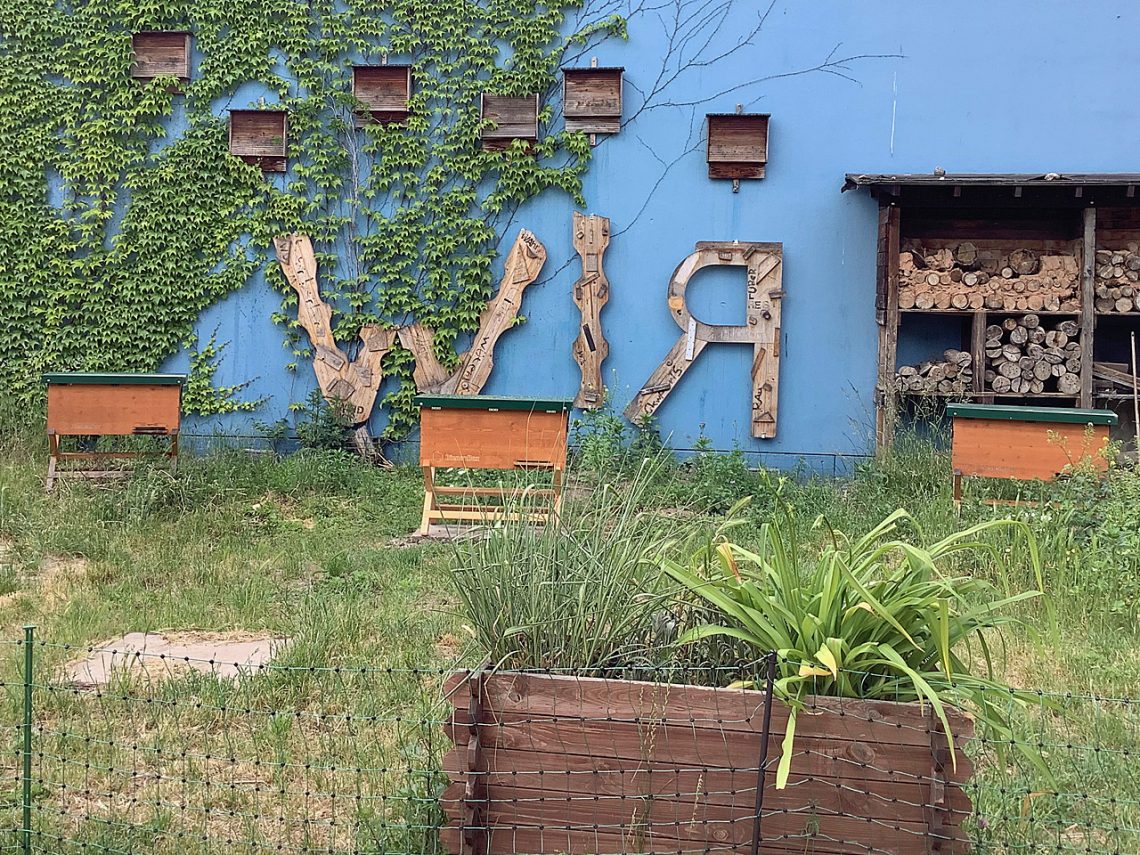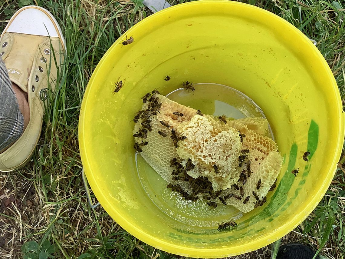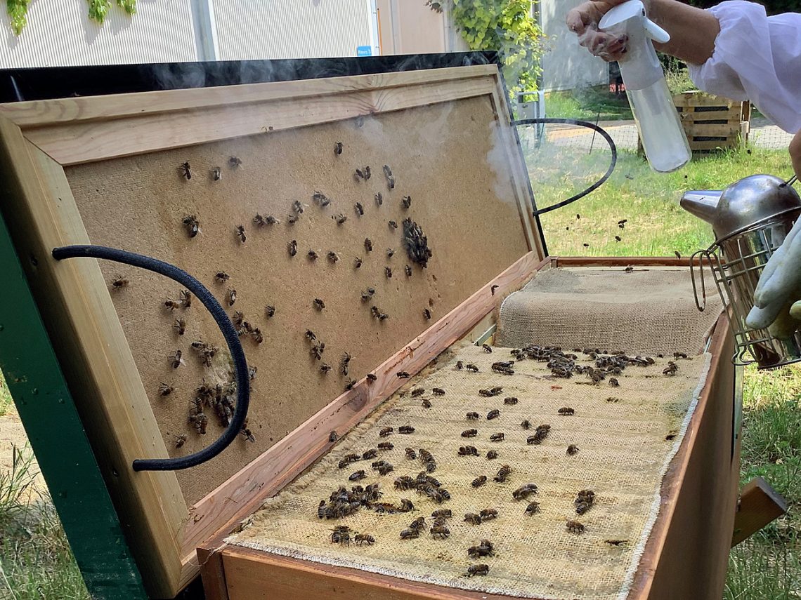Weil das Volk danach in Schwarmstimmung war, entstand der dritte Bienenstock am Campus. Das darin lebende Bienenvolk entwickelt sich gut. Zum Schutz gegen die Varoamilbe wird es ebenso wie die anderen mit Oxalsäure behandelt. Die Milben sind sehr gefährlich für Bienen, weil sie deren Körperteile auffressen.