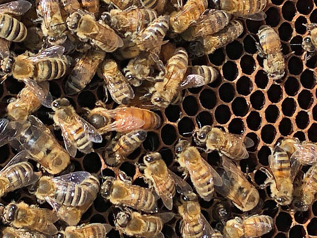 Vor ein paar Wochen gab es im ersten Stock drei Weiselzellen (Weisel = Bienenkönigin). Das sind Töpfchen, in denen die amtierende Bienenkönigin ein Ei legt und die Ammenbienen Gelee Royal ansetzen. Schlüpfen aus mehreren Töpfchen neue Bienenköniginnen, tötet die als erstes geschlüpfte Königin die anderen. Bienen-Königinnen werden vier bis fünf Jahre alt, Arbeiterinnen nur etwa 35 Tage alt.
