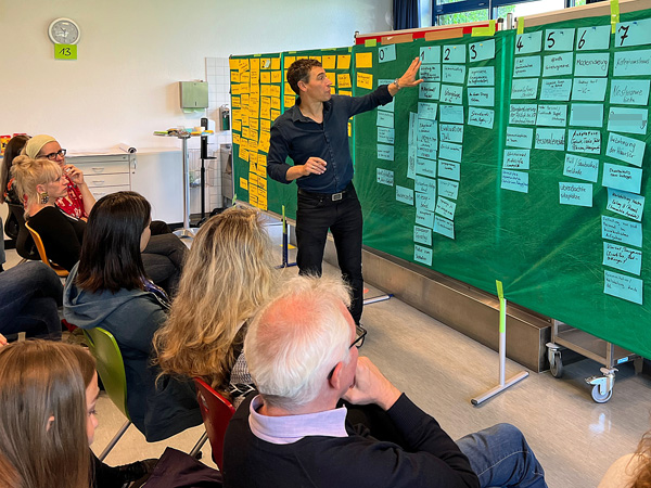 Am zweiten Studientag im Mai ging es darum, in welchen Bereichen unsere Gemeinschaftsschule schon sehr gut aufgestellt ist und wie sie weiter entwickelt werden kann. Hieran nahmen nicht nur Lehrerkräfte, Erzieher*innen und Fellows teil, sondern auch Schüler*innen. In gemischten Gruppen sammelten und befassten sie sich mit Themen wie der Einbindung von neuen Kolleg*innen, dem Leistungsbewertungssystem, der Gestaltung des Mittagsbands, außerschulischen Lernorten, der Medienkompetenz am Campus oder einer Verewigungswand für abgehende Schüler*innen.