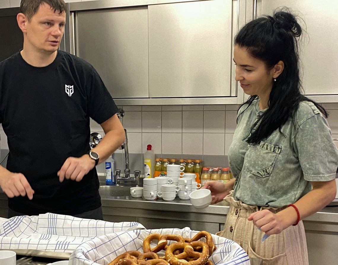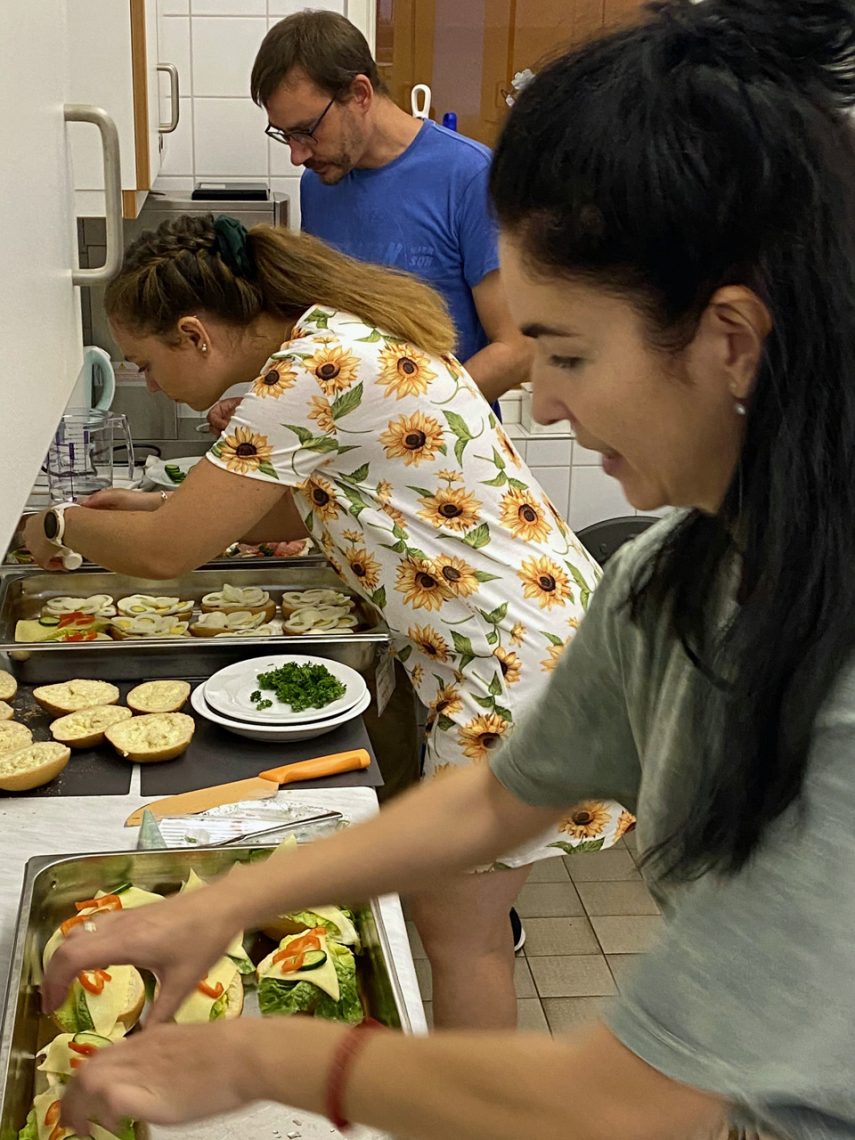 Während Herr Wewer und Frau Ernst, die Office Managerin, uns durch die Küche führen, bereiten die Köch*innen gerade in riesigen verschließbaren Kochbecken Chili con Carne und als Alternative die vegetarische Variante Chilli sin carne zu. 250 kg Bio- Rinderhackfleisch sowie Bohnen und Mais werden dafür verwendet, dazu kommen beim Auffüllen Nudeln, die jetzt noch in Tüten einen ganzen Rollwagen befüllen. Zum Umrühren der Bohnen und Mais greifen die Köch*innen zu riesigen Rührbesen und Schöpfkellen.
