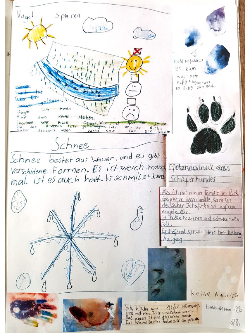 Wir gehen raus, zum Beispiel zum Seggeluchbecken und zeichnen Tiere auf. Dann gehen wir in die Klasse, besprechen Sachen zu den Tieren und schreiben diese auf. Wir kleben die Blätter, die wir gemacht haben, in unser Entdeckerheft.