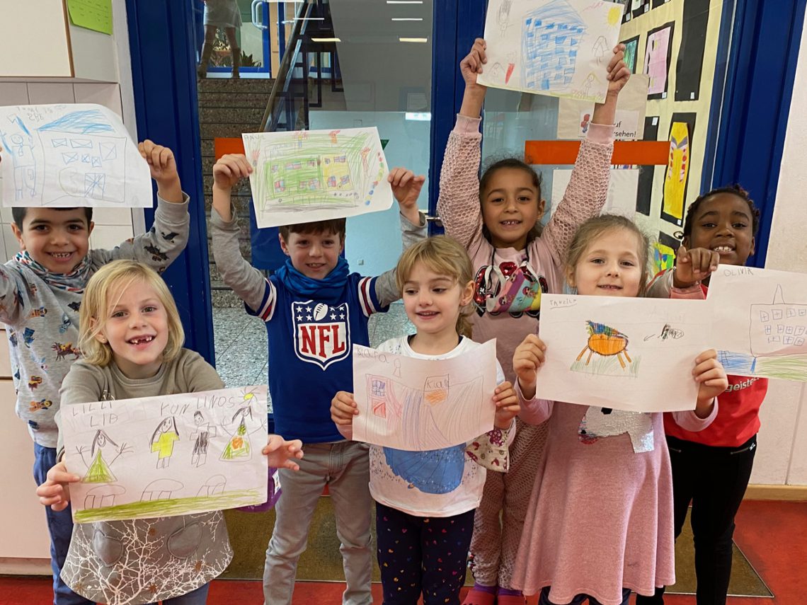 Die Sonnen der 123a haben Bilder über ihre Schule gemalt und zeigen sie.