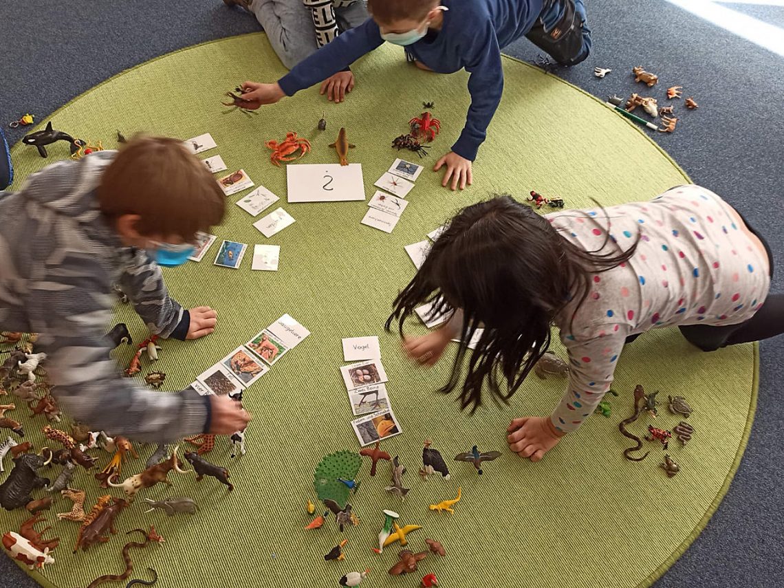 Im Sachunterricht hat Frau Schliepach uns Arbeitsblätter mitgebracht. Wir saßen im Kreis und zwischen uns lag ein riesiger Haufen Spielzeugtiere. Die mussten wir anhand ihrer Merkmale den unterschiedlichen Tiergruppen zuordnen. Es gibt zum Beispiel die Gruppen Säugetiere, Vögel, Amphibien, Reptilien, Fische, Insekten, Spinnentiere und wirbellose Tiere.