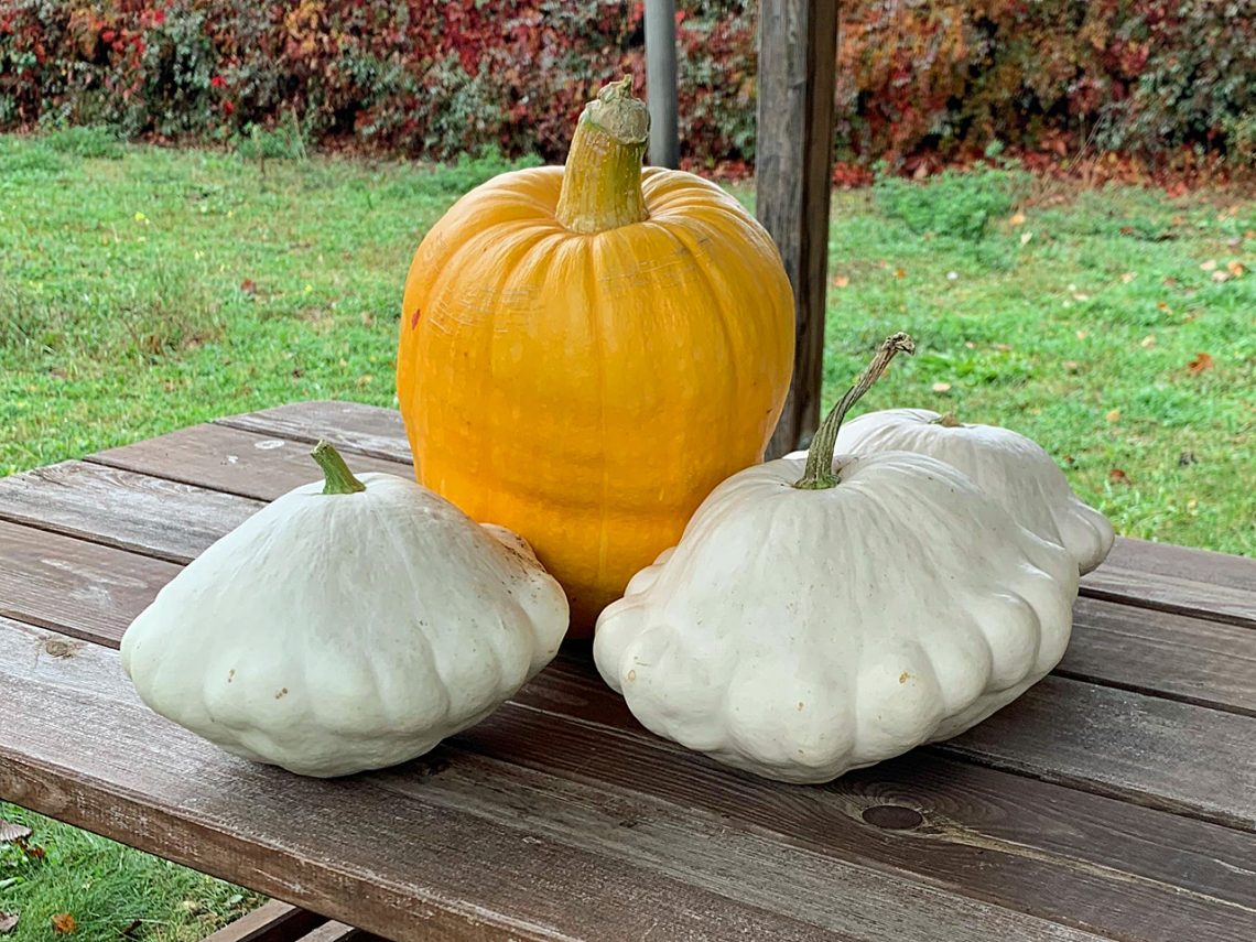 Wir ernteten einen riesigen Spaghettikürbis, der leuchtend gelb war, und drei weiße Partissonkürbisse, die wie kleine und große Ufos aussehen.