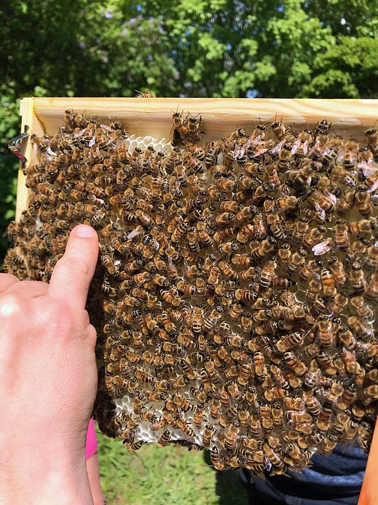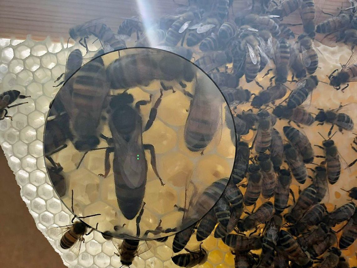 Der zweite, im Juni begrüßte Schwarm macht den Imkerinnen schon länger etwas Sorgen, weil dort die Königin nicht so aktiv ist wie ihre Nachbarin und weniger Nachwuchs produziert. Vermutlich ist diese Bienenkönigin schon etwas älter.