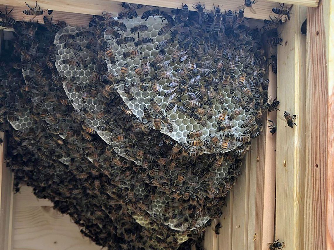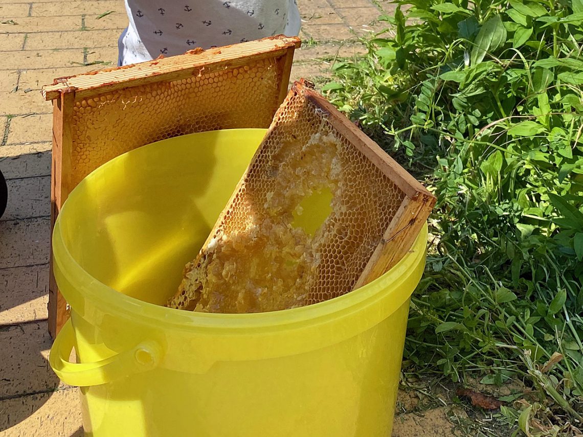 Das erste, im Mai angesiedelte Bienenvolk hat sich so prächtig entwickelt, dass die Imkerinnen diese Bienchen schon liebevoll „Streber“ nennen: 17 Kilogramm produzierten Honig haben die Imkerinnen im Stock ausgemessen. Das ist genug für die Bienen, um durch den Winter zu kommen. Ein bisschen davon haben die Mitarbeiterinnen des Campus Ende August geerntet, damit die Schüler*innen den Lerngruppen davon kosten können. Dabei stellten die Kinder fest: Der Campus-Honig schmeckt ein bisschen nach Minze.