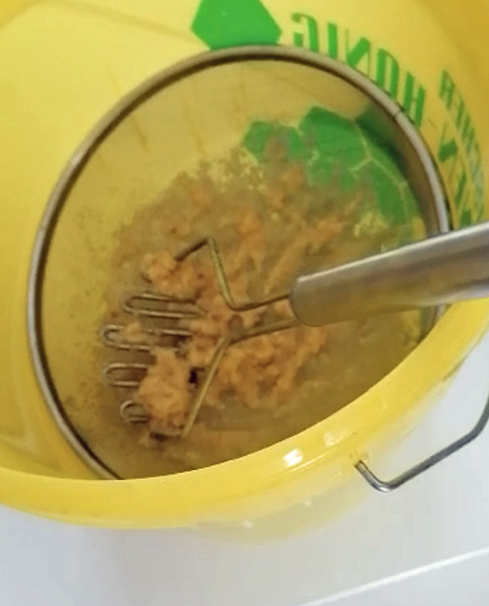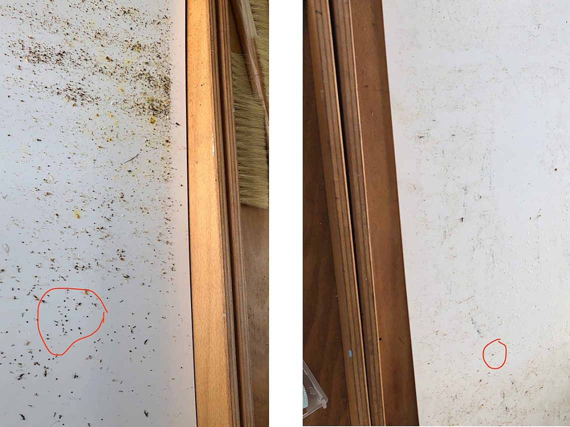 Auch hier kämpfen Bienen und Imkerinnen gegen die Varroamilbe, allerdings in viel geringerem Maße und daher mit der im Vergleich zur Ameisensäure weniger aggressiven Oxalsäure. Diese schädigt nicht die Brut der Bienen. Diese Behandlung wird in den nächsten Wochen noch alle vier Tage durchgeführt, damit diese Bienen nicht auch schlimmer erkranken.