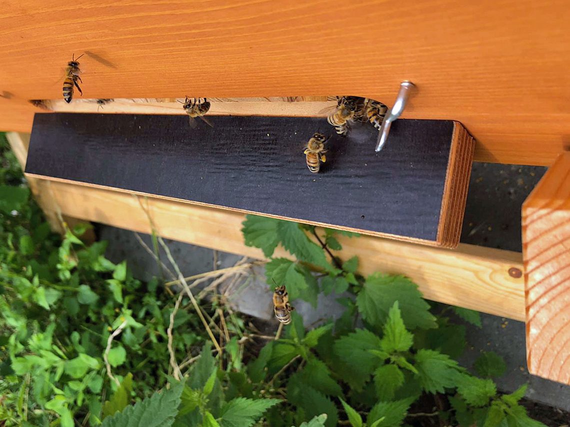 Und um sie vor Räubern wie Hornissen und Wespen zu schützen, haben die Imkerinnen das Flugloch des Stocks verkleinert.